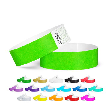 Tyvekbänder sind aus einem Material gefertigt, welches haptisch einem Papier ähnelt. Sie gehören zu den preisgünstigsten Einlassbändern. Tyvek Kontrollbänder sind grundsätzlich fortlaufend nummeriert, so dass sich die verkauften Tickets zu jeder Zeit nachvollziehen lassen. Tyvek ist absolut wasserfest, reißfest sowie beständig gegen Kosmetika, Schweiß, Hitze und Sonneneinstrahlung. Tyvekbänder sind zudem federleicht und angenehm am Handgelenk zu tragen. Tyvek Kontrollbänder können zur farbcodierten Eintrittsberechtigung unbedruckt in unterschiedlichen Farben geliefert werden. Tyvek Einlassbänder lassen sich aber auch fotorealistisch individualisieren, Aufdrucke können einfarbig oder mehrfarbig, nach CMYK, gestaltet werden. Im Shop können Sie aus folgendem Standard-Sortiment Tyvek-Armbänder bestellen: