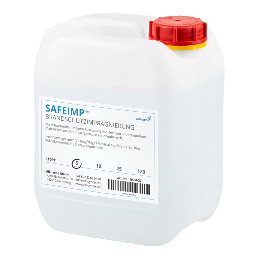 Das Flammschutzmittel Safeimp® ist das Mittel der Wahl für alle Naturfasern mit geringem Synthetikanteil. Die halogenfreie Imprägnierung eignet sich vor allem als Brandschutz für Dekorationsartikel wie Trockensträuße und Präparationen von Materialien wie Stroh, Heu oder Kokosfasern. Die hochkonzentrierte Brandschutzimprägnierung kaufen Sie im Shop als Kanister mit wahlweise 5l, 10l oder 25 l Füllmenge.