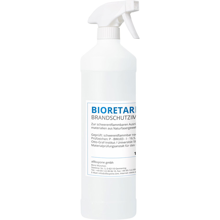 Brandschutzspray | Bioretard® | 1 Liter Sprühflasche | Brandschutzmittel für Naturfasern, Molton, Papier, Pappe, Textilien etc. | anwendungsfertig, hochwirksam | wässrige Lösung zur Flammschutzausrüstung gemäß DIN 4102