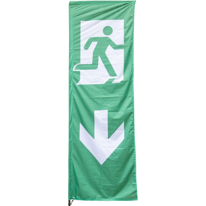 The escape route flag is an important part of safety signage at large events, trade fairs and open-air events, which is why the flag should always be clearly visible and in good condition. The replacement flag for containers/construction site fences complies with the current, internationally valid standard DIN EN ISO 7010 (formerly DIN 4844). The escape route flag has an emergency exit pictogram with a downward direction arrow in white and is printed in green over the entire surface. The flags are B1-certified and comply with fire safety regulations. The flame-retardant rescue signs can also be used indoors without any problems.
