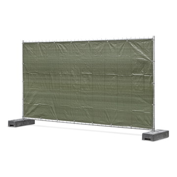 Green fence tarps are often used as view protection tarps for events. With dimensions of 3.41 x 1.76 m, the tarp with eyelets is designed to fit perfectly on a construction fence. The opaque tarps are equipped with rustproof eyelets all around and have a hemmed edge. The fence cover can be quickly attached to construction and mobile fences with cable ties. The view protection tarp is waterproof and UV-stabilized. On construction sites, the fence net view protection is also used as a dust protection tarp or cover tarp .
