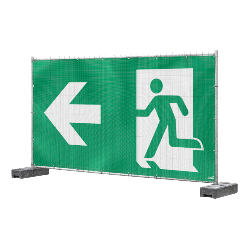 emergency exit banners | Emergency exit left | Emergency exit banners for site fences | 3.41 x 1.76 m | green and white | emergency exit left | escape route guidance system on the site fence according to EN ISO 7010 | with eyelets all around | wind-permeable | B1-certified