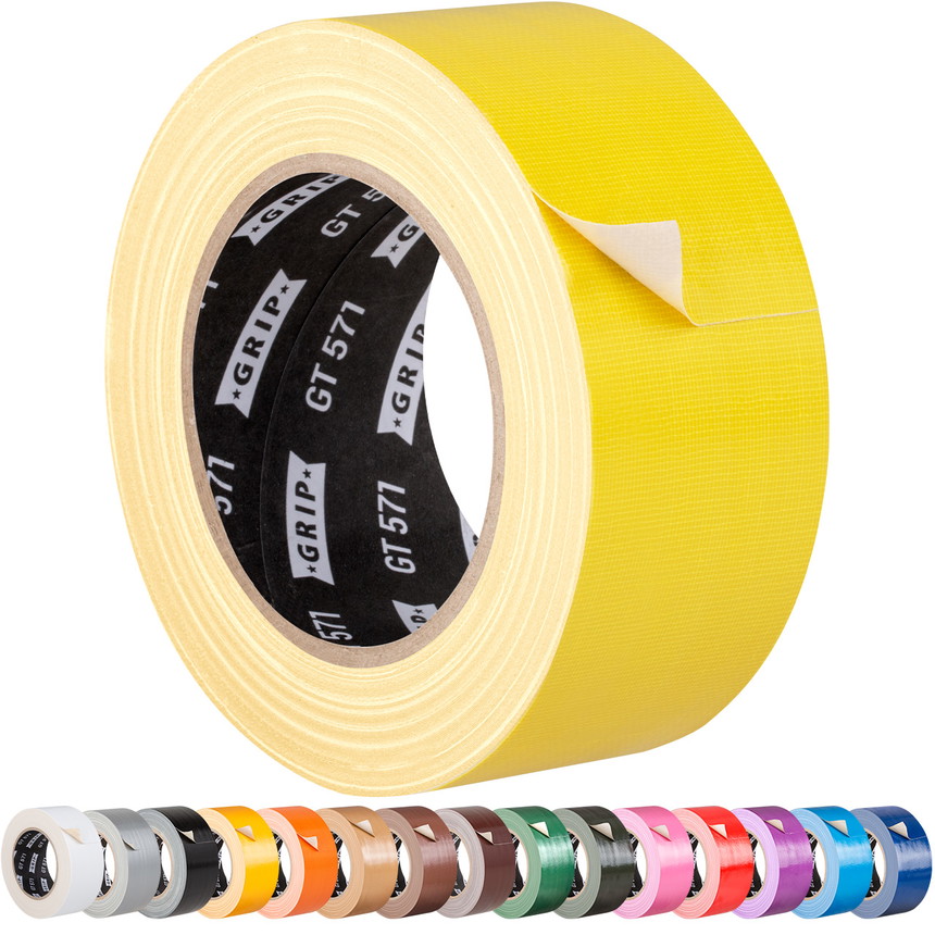 Thanks to]its high quality, the GT 571 cloth tape is particularly popular with event professionals, which is why we also have it available in other versions for you to choose from: In black, silver and white (50 m long, 50 mm wide), as a black and yellow striped warning tape, as a tunnel tape with an adhesive-free centre, as a fluorescent neon tape (neon pink, orange, green, yellow) and as an extra-wide cloth tape in 100 mm width.