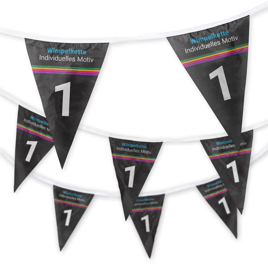 The pennant garlands from allbuyone can be designed yourself and printed with recurring motifs. You decide whether 1, 4 or 8 motifs are printed alternately on the 10 m long pennant chain. T he base colour is white, and we print your motif over the entire surface of the pennants. The pennant chains are made of fabric; we use high-quality flag fabric that not only flutters beautifully in the wind but also makes the print clearly visible on the back. The material is flame-retardant B1-certified and can be used indoors and outdoors without hesitation.