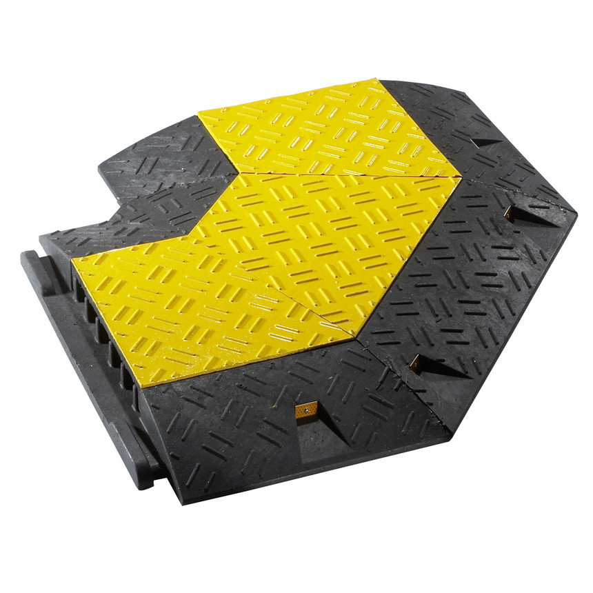 The cable protector angle element is highly resilient with a load capacity of up to approx. 7 t on an area of 63 x 33 cm and can therefore be driven over by trucks, forklifts and other vehicles. The element has a non-slip surface and a bevelled side edge with reflectors.