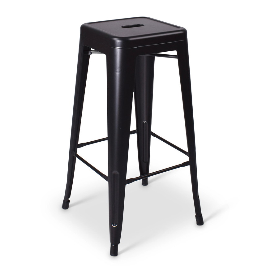 The stackable bar stool can be ordered in a simple industrial design made of high-quality metal in matt black. The stool has a seat height of 76 cm, the seat measures approx. 30 x 30 cm. The bar stool also has a footrest. Thanks to a recess in the seat, the stool is easy to transport and can be stacked to save space.