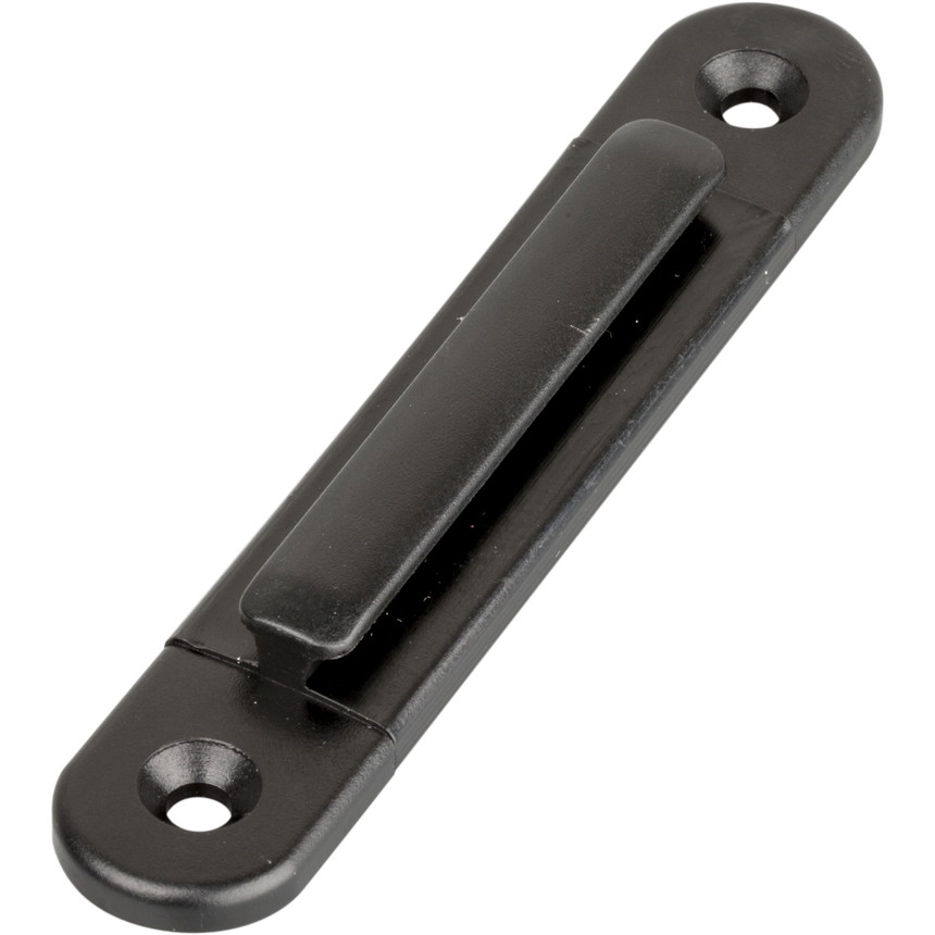 The wall bracket is made of black plastic and measures 9.7 x 1.7 x 0.9 cm (height, width, depth). The scope of delivery includes 1 belt wall bracket, 6 screws and 6 dowels.