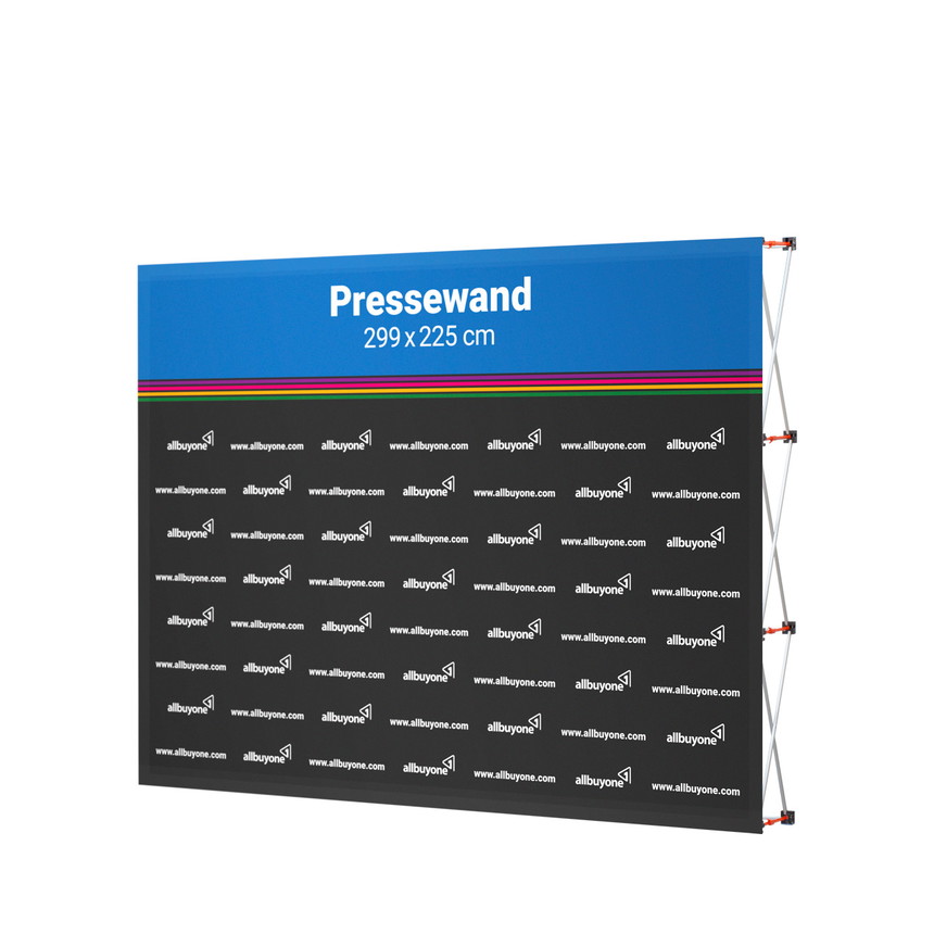 You can purchase the press wall from allbuyone in 3 sizes, each 225 cm high and in various widths. We would be happy to advise you personally on the press wall! Alternatively, you will also find a press wall with side panels in our shop.
